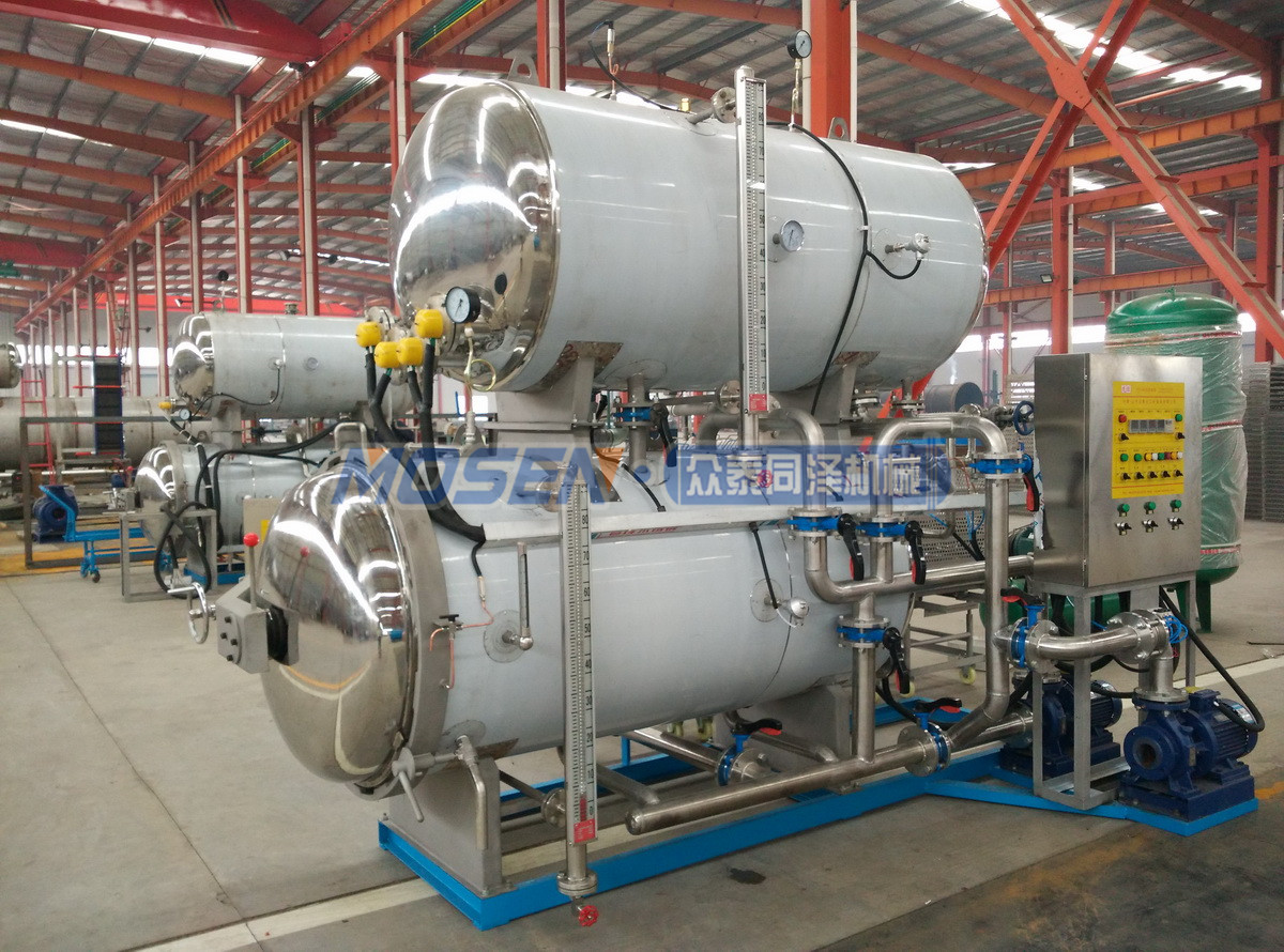 1、 热水循环式杀菌:杀菌时锅内食品全部被热水浸泡,这种方式热分布比较均匀。